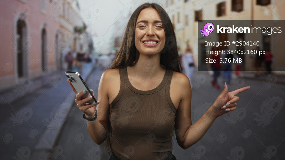 Woman smiling holding smartphone and pointing finger on city street amid historic buildings and blurred pedestrians; urban travel happiness.