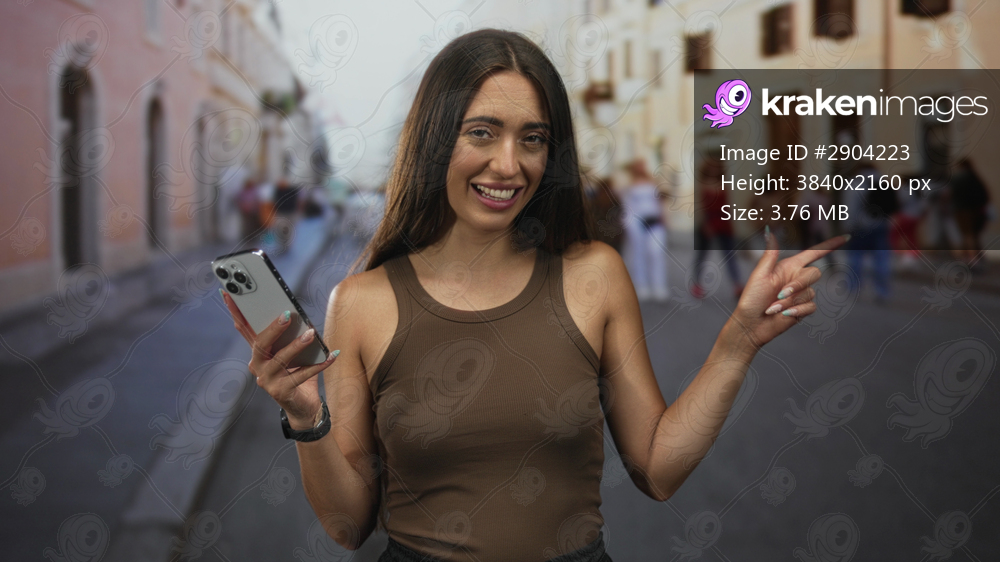 Woman smiling holding smartphone and pointing finger on city street amid historic buildings and blurred pedestrians; urban travel happiness.