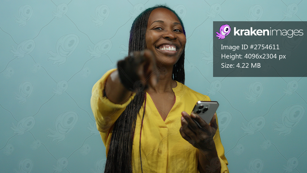 Woman smiling holding smartphone standing against blue background wearing yellow shirt pointing arm towards camera exemplifying confidence positivity and connection. - Kraken Images