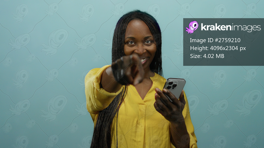 Woman smiling holding smartphone standing against blue background wearing yellow shirt pointing arm towards camera exemplifying confidence positivity and connection. - Kraken Images