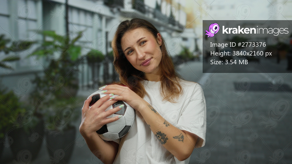Woman smiling holding soccer ball on urban city street in casual attire, showcasing tattoos and happiness in an outdoor environment, conveying youthful vibrancy and urban lifestyle. - Kraken Images