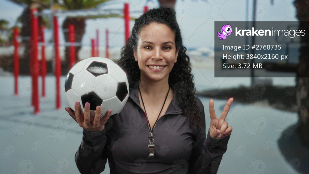 Woman smiling holding soccer ball outdoors near gym with beach background wearing black, displaying peace sign, symbolizing sports relaxation and enthusiasm.
