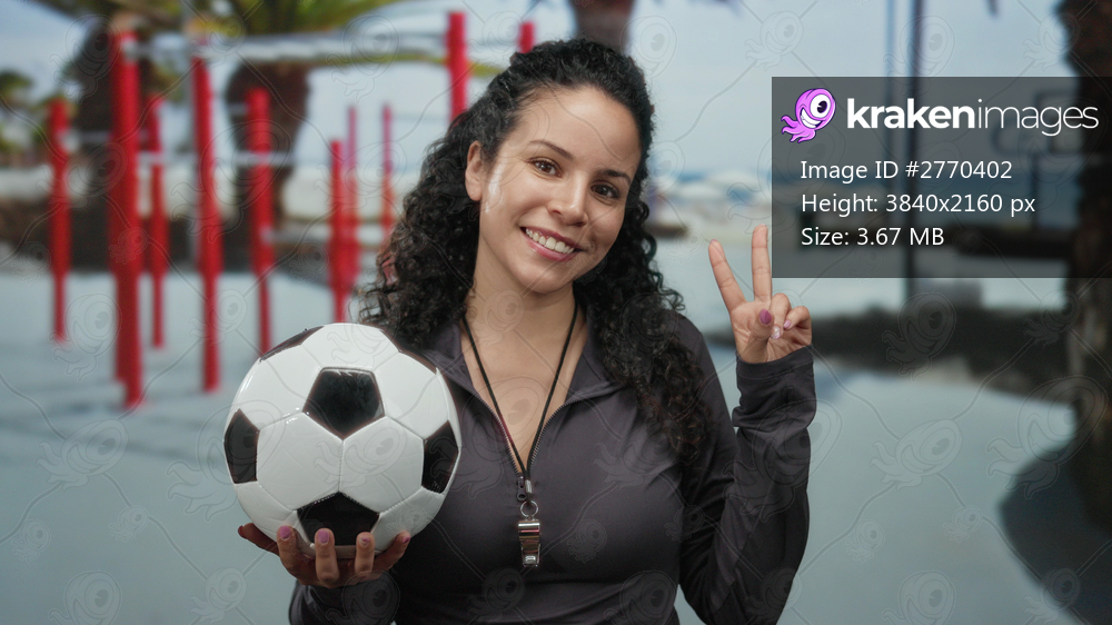 Woman smiling holding soccer ball outdoors near gym with beach background wearing black, displaying peace sign, symbolizing sports relaxation and enthusiasm.