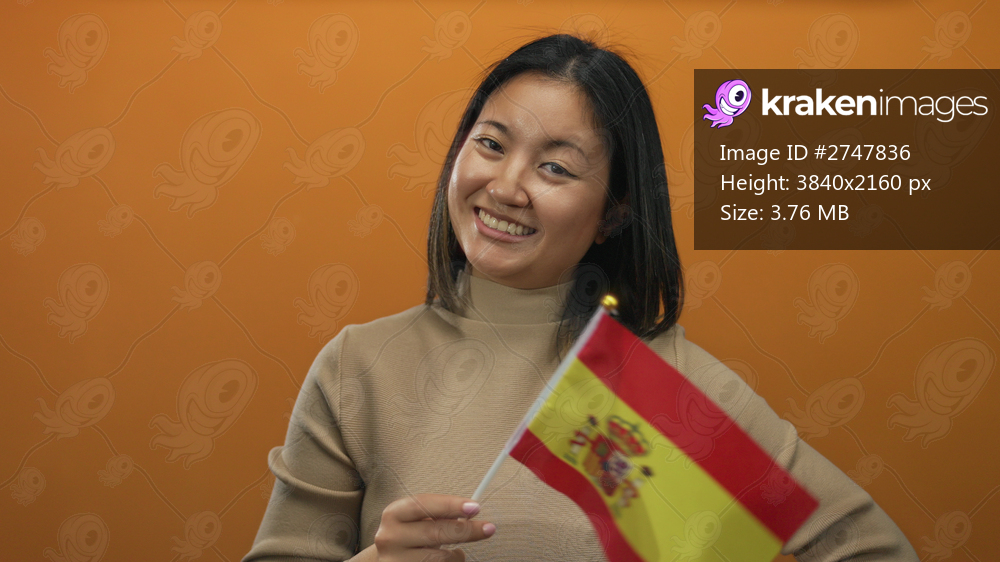 Woman smiling holding spain flag against orange background showcasing cultural diversity and pride.
