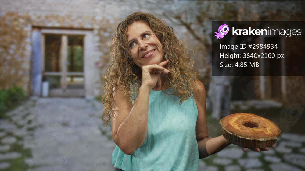 Woman smiling and holding sponge cake with hand to chin, curly hair, in stone building courtyard; homemade warmth.