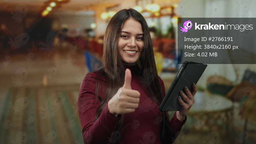 Woman smiling holding tablet giving thumbs up in a hotel lobby setting showcasing a positive and relaxed atmosphere indoors.
