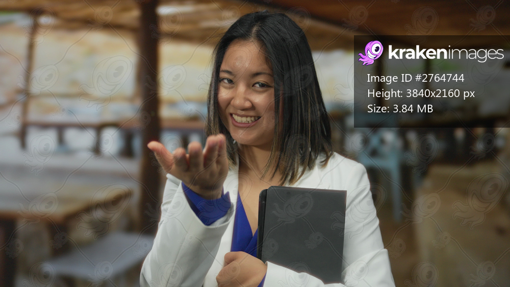 Woman smiling holding tablet on a city terrace, wearing a white jacket, with an outdoor restaurant setting, suggesting a casual yet professional scene. - Kraken Images