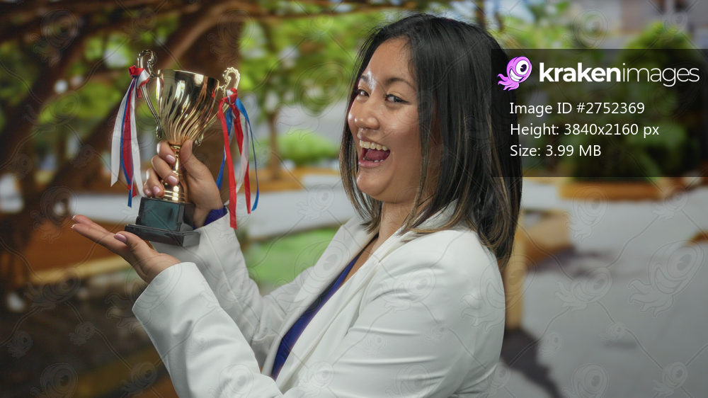 Woman smiling holding trophy outdoors in park setting vibrant scene capturing success and achievement in young asian professional life.