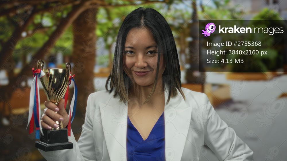 Woman smiling holding trophy outdoors in park setting vibrant scene capturing success and achievement in young asian professional life.