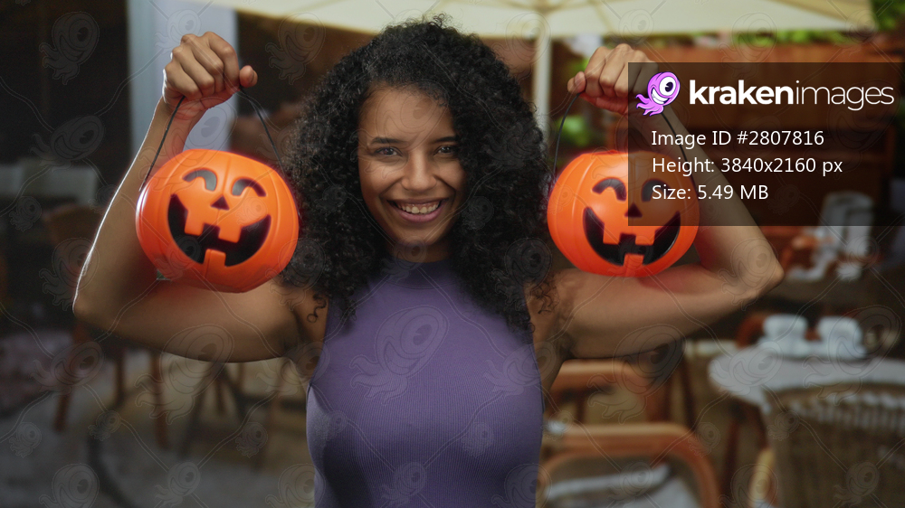 Woman smiling holding two pumpkin baskets indoors at restaurant terrace during halloween celebration suggesting festive atmosphere and joyful expression enhanced by vibrant decor.