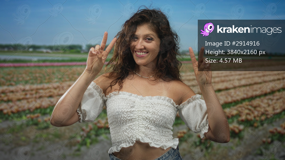 Woman smiling, holding up peace signs with both hands in a colorful flower field and bare midriff; joy carefree summer.