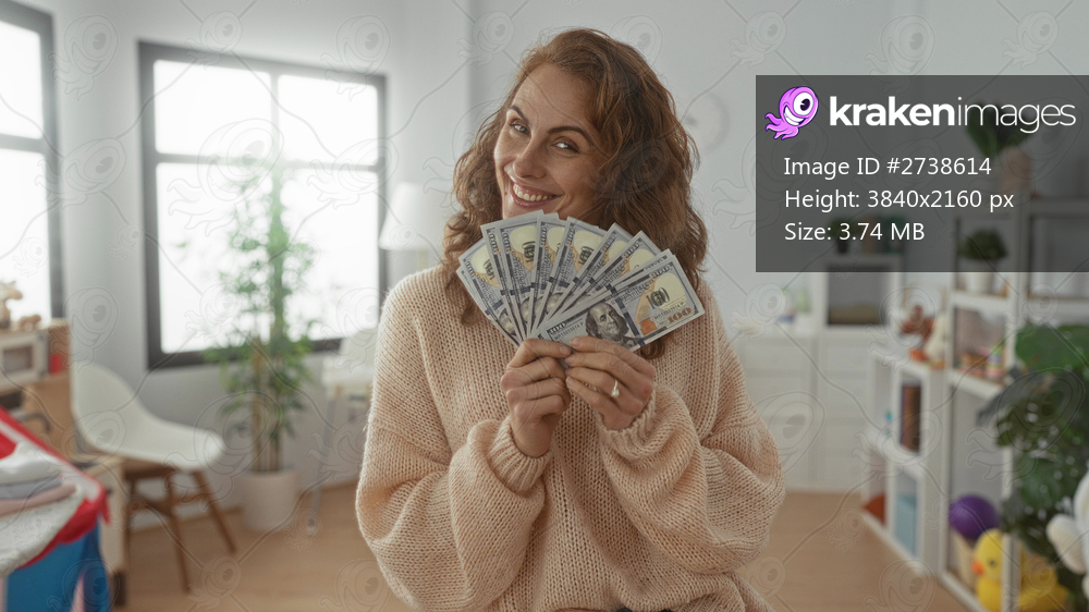 Woman smiling holding us dollar bills in cozy living room with plants and modern furniture, conveying happiness and financial success amidst home comfort. - Kraken Images