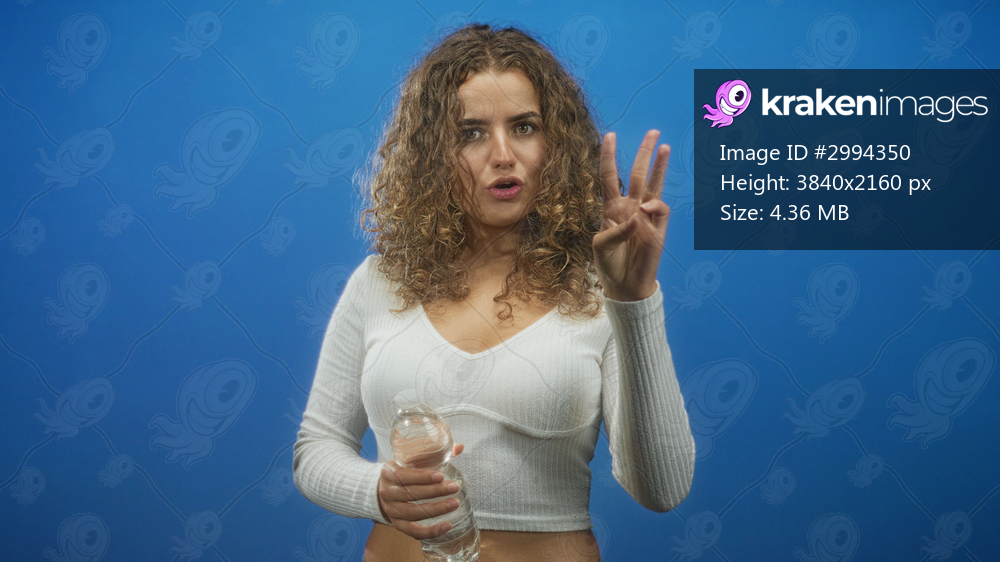 Woman smiling holding water bottle and making peace sign, white crop top in studio; playful refreshment.