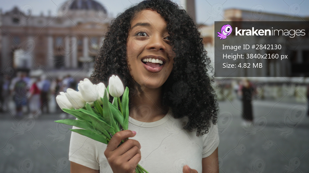 Woman smiling and holding white tulips with curly hair framing her face on street in the vatican; wonder.