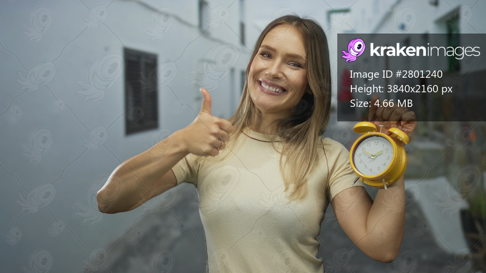 Woman smiling holding yellow clock with thumbs up on city street showcasing time management and positivity outdoors in urban setting.
