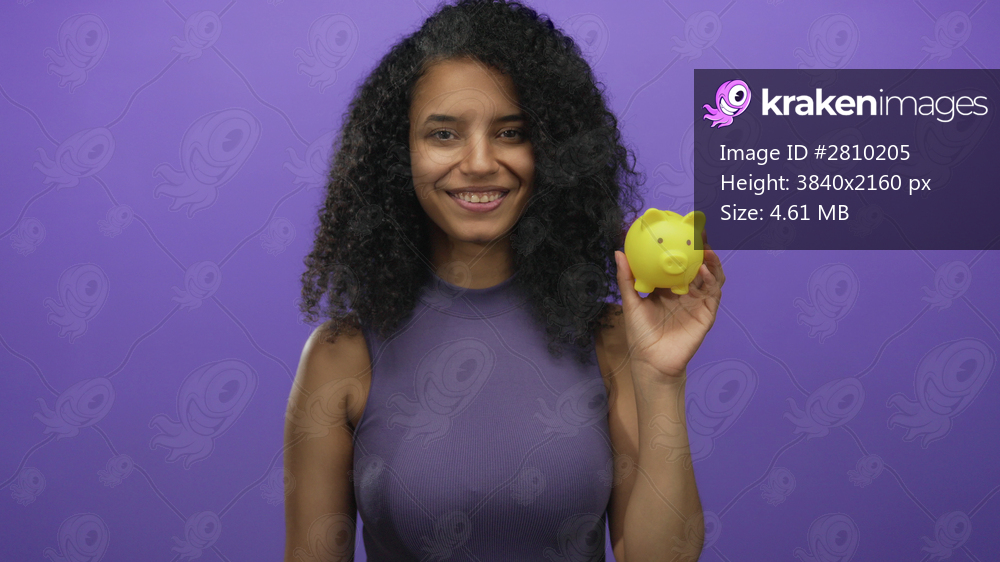 Woman smiling holding yellow piggy bank against purple background implying financial savings or investment concept