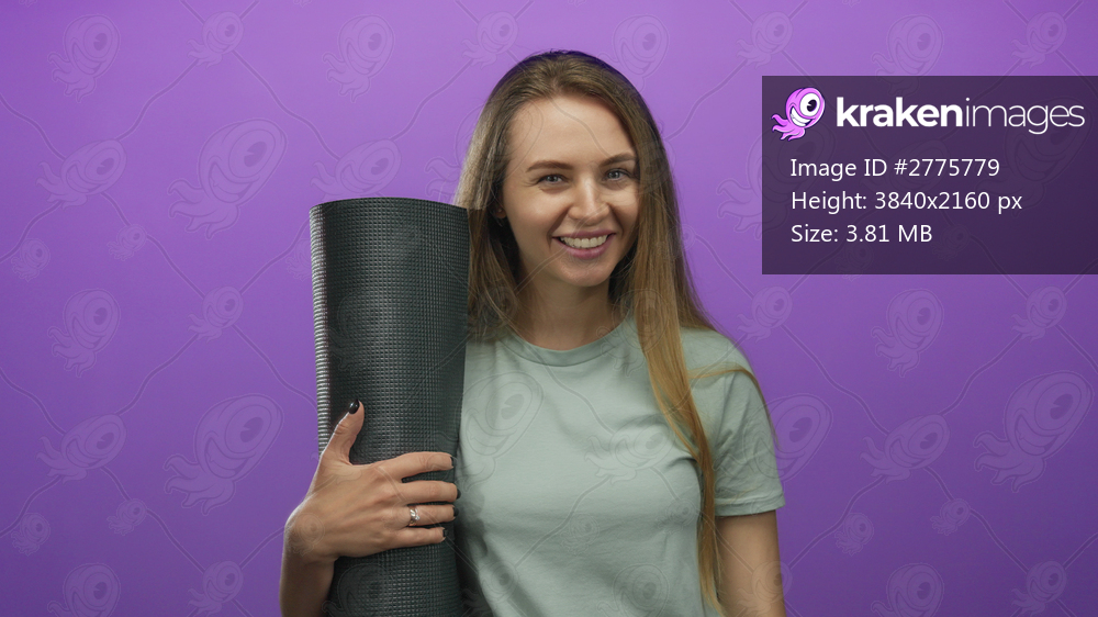 Woman smiling holding yoga mat against a vibrant purple background exuding happiness and relaxation in an isolated indoor setting perfect for wellness concepts. - Kraken Images