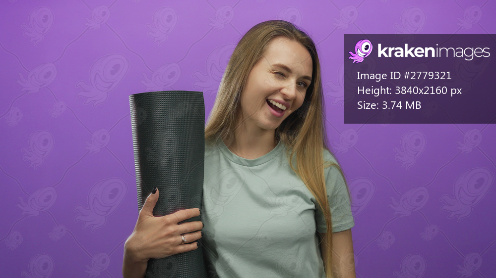 Woman smiling holding yoga mat against a vibrant purple background exuding happiness and relaxation in an isolated indoor setting perfect for wellness concepts. - Kraken Images