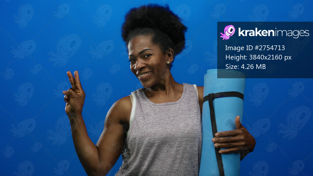 Woman smiling holding yoga mat on blue background showing peace sign wearing tank top fitness concept