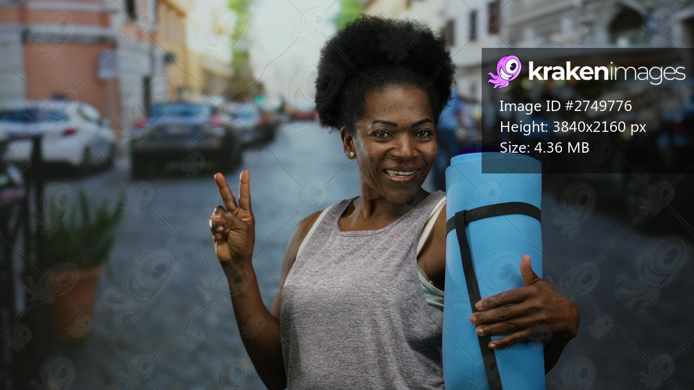 Woman smiling holding yoga mat on city street showing peace sign capturing urban outdoor lifestyle