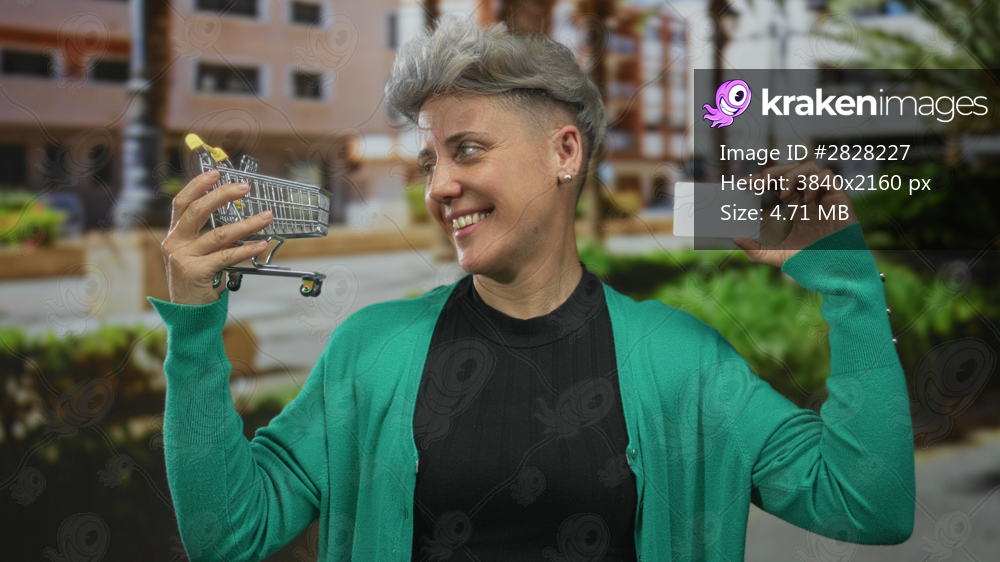 Woman smiling holds a colorful mini shopping cart and blank plastic card before a building facade; empowerment.