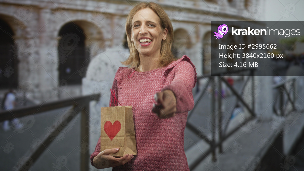 Woman smiling holds a paper bag with a red heart and points finger at camera beside the colosseum stone railing; giving joy.