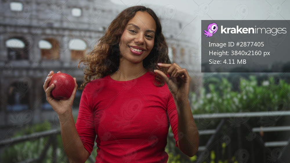 Woman smiling holds a red apple in one hand and pinches fingers with the other on a balcony in front of an ancient building; joy.