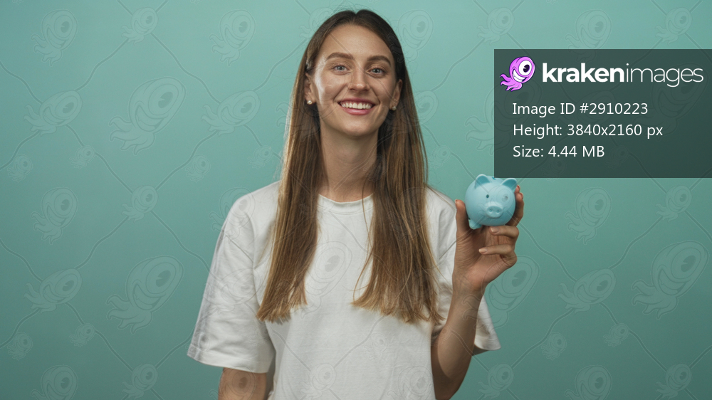 Woman smiling holds blue piggy bank in right hand wearing white t shirt in mint studio; savings optimism security.