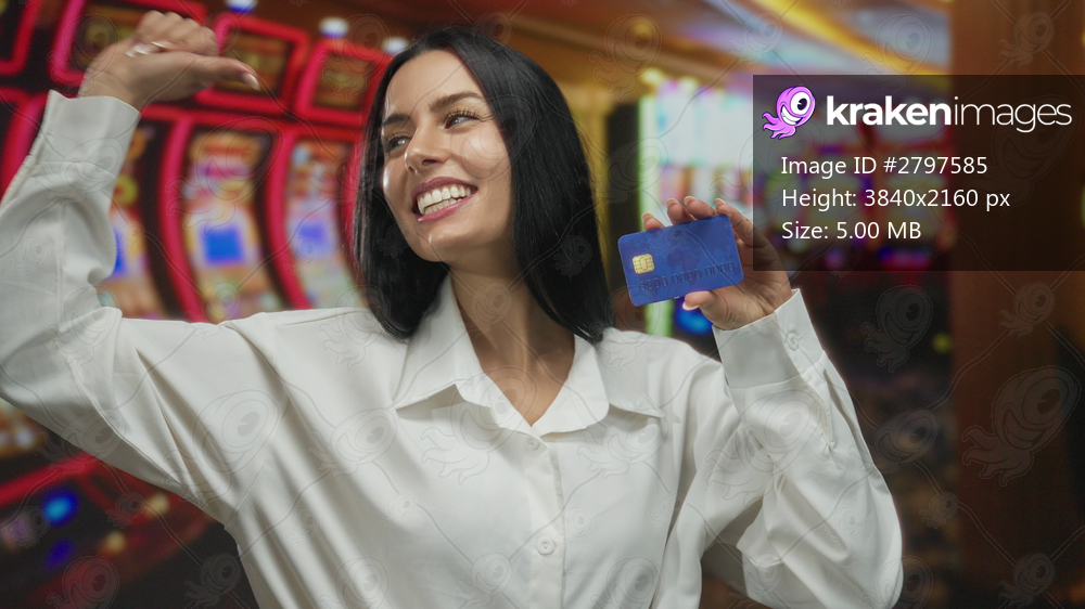 Woman smiling holds card casino slot machines lively atmosphere indoors capturing excitement win.