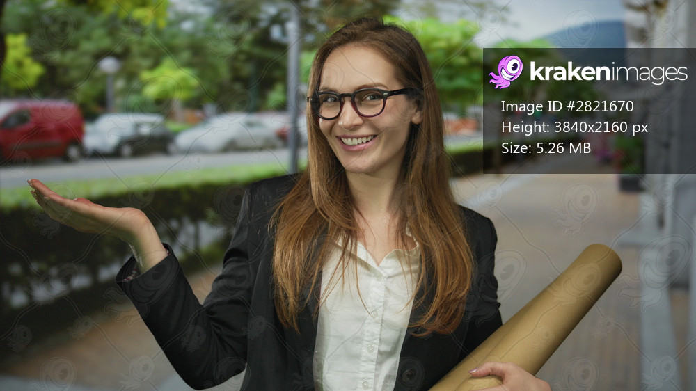 Woman smiling holds cardboard tube in one hand and gestures palm up with the other on street; confidence ambition.