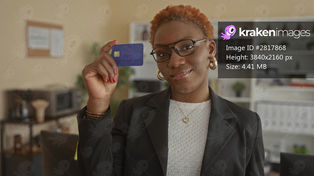 Woman smiling holds creditcard in hand facing camera in modern office setting; confidence empowerment.