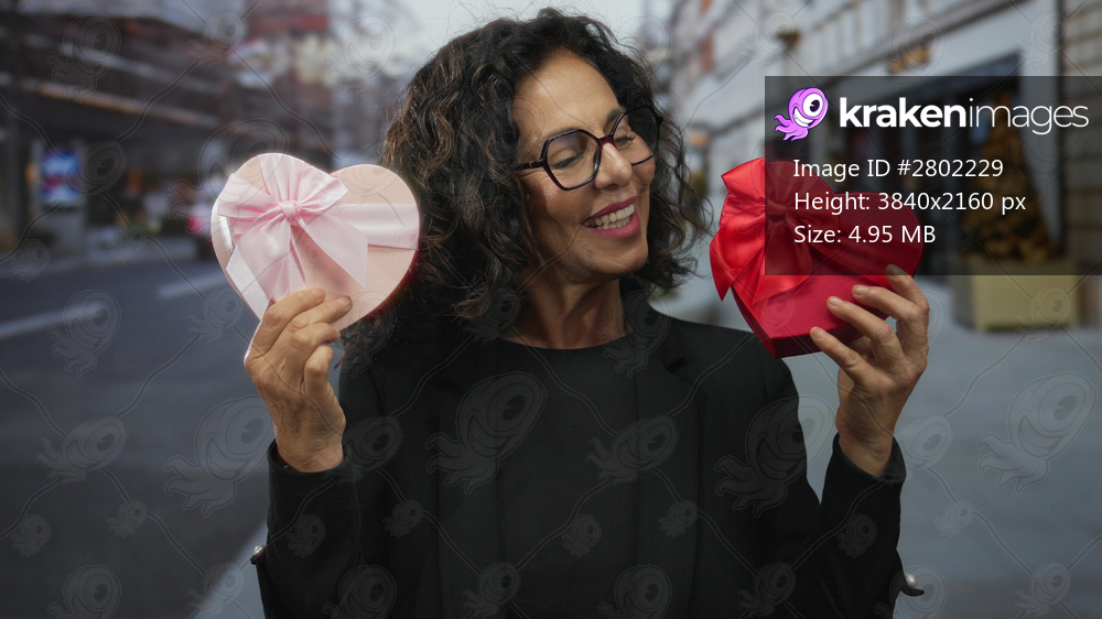 Woman smiling holds heart-shaped gift boxes on an urban street, expressing joy and celebration during the festive outdoor scene.