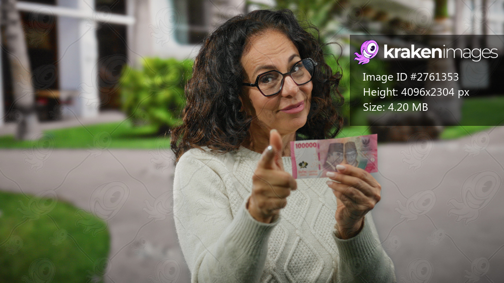 Woman smiling holds indonesian rupiah banknote on urban street, middle age, glasses, outdoors, wearing white sweater, confident expression, vibrant, city backdrop, financial concept.