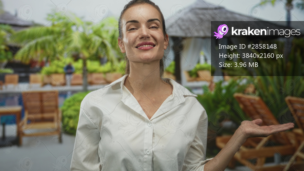 Woman smiling holds open palm by sunny hotel building wearing white shirt; welcoming hospitality invitation.