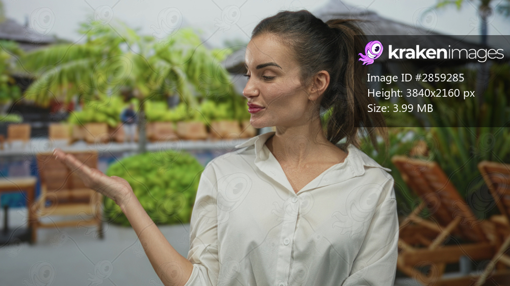 Woman smiling holds open palm by sunny hotel building wearing white shirt; welcoming hospitality invitation.