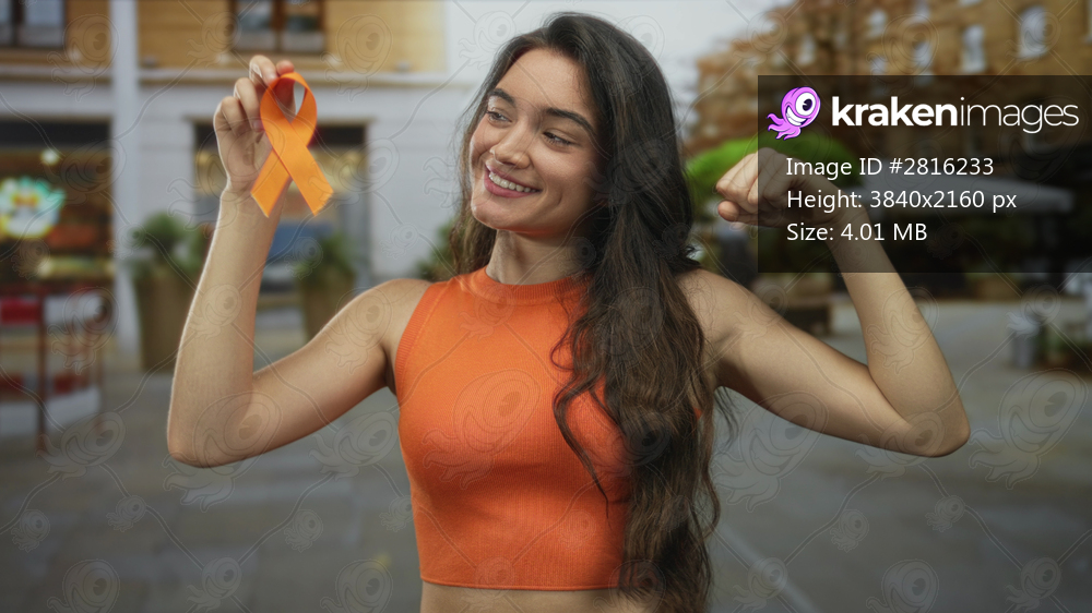 Woman smiling holds orange ribbon and flexes bicep on city street; empowerment awareness support solidarity.