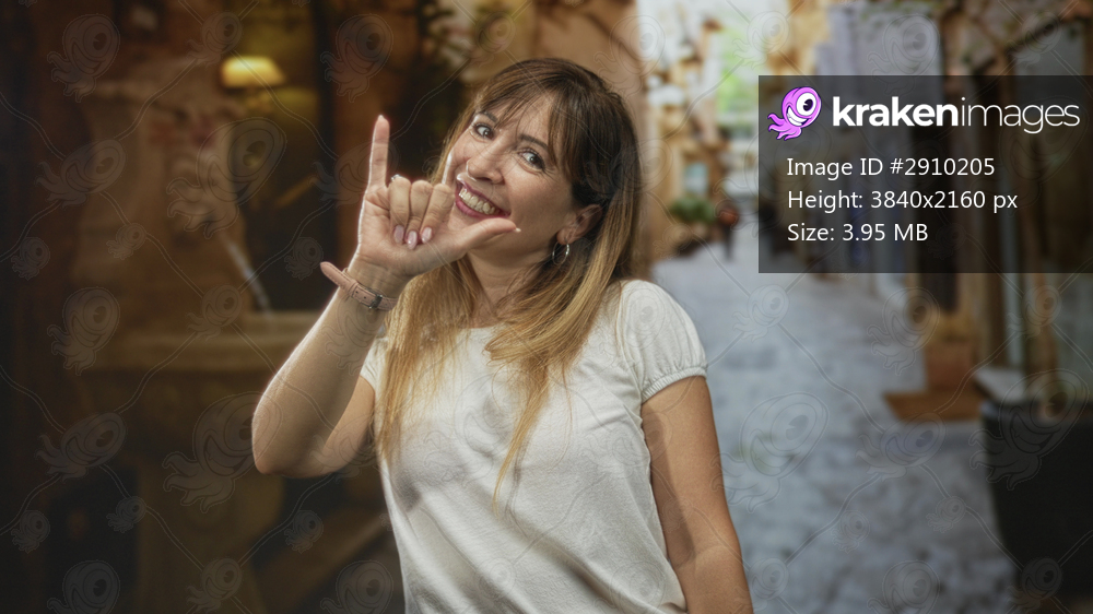Woman smiling holds pinky finger up in a narrow cobblestone street with fountain and storefronts in view; playful promise.