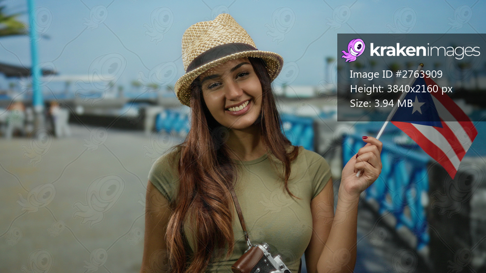 Woman smiling holds puerto rican flag at port under blue sky wearing hat with camera capturing her outdoor adventure in vibrant setting celebrating travel culture and patriotism. - Kraken Images