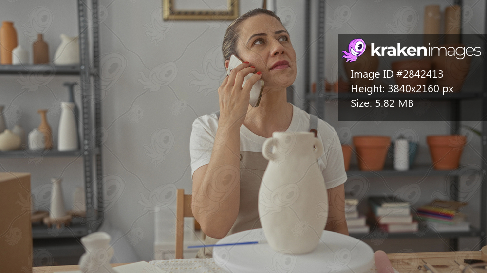 Woman smiling holds smartphone to ear beside ceramic vase on pottery wheel on work table in studio; contentment.