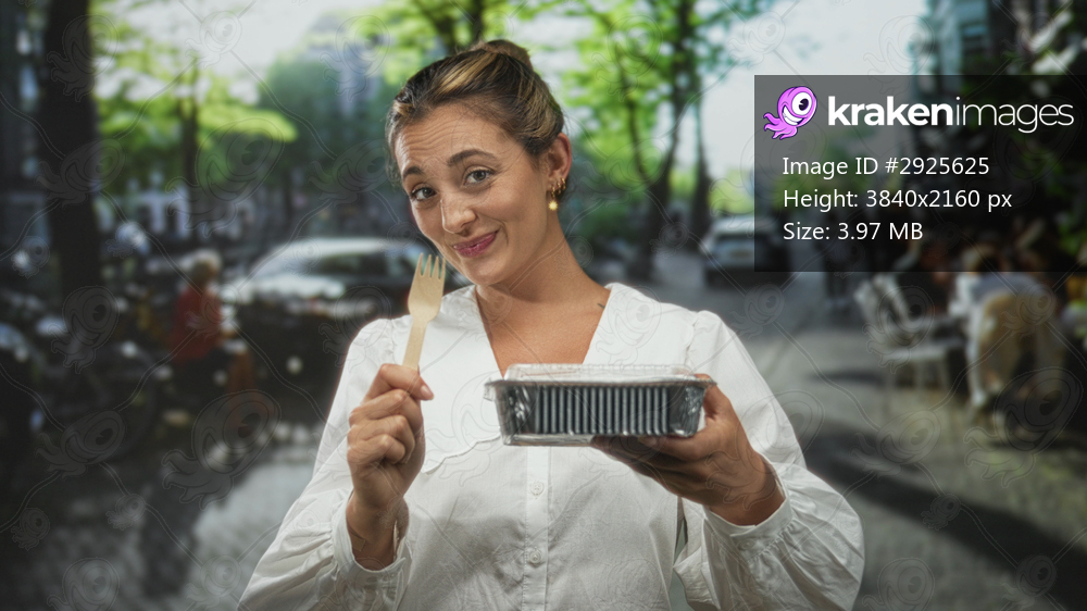 Woman smiling holds takeout container and wooden fork on city street in daylight; casual community dining joy.