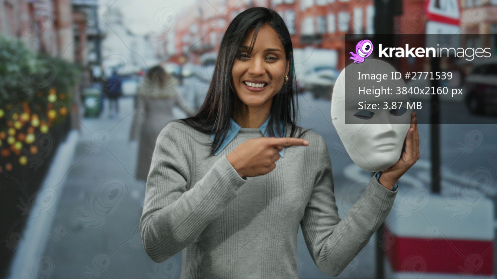 Woman smiling holds white mask street background urban setting daytime showcasing mystery and intrigue in vibrant city life.