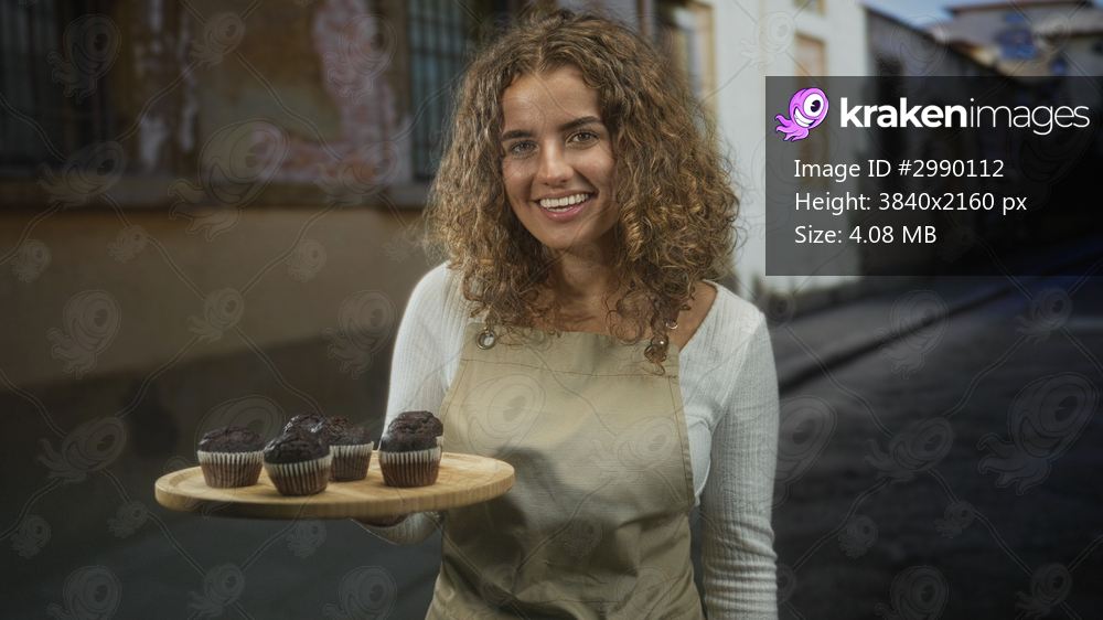 Woman smiling holds wooden tray of chocolate muffins with outstretched hand on street; friendly warmth.