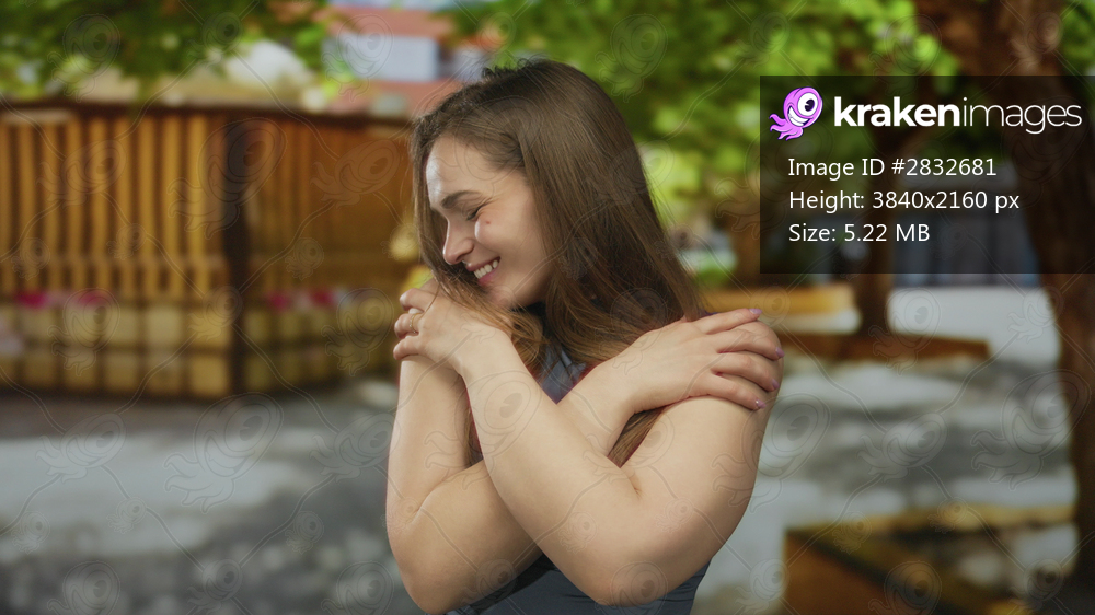 Woman smiling hugging herself with arms crossed in a green outdoor building setting; self love serenity.