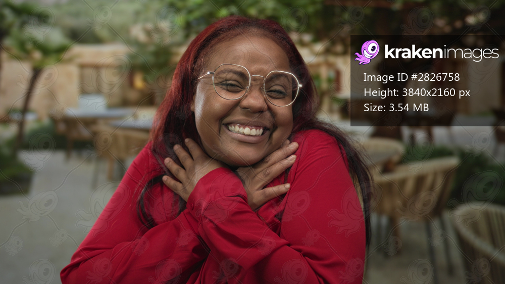 Woman smiling and hugging herself with crossed arms on building terrace outdoors in a red blouse; gratitude.