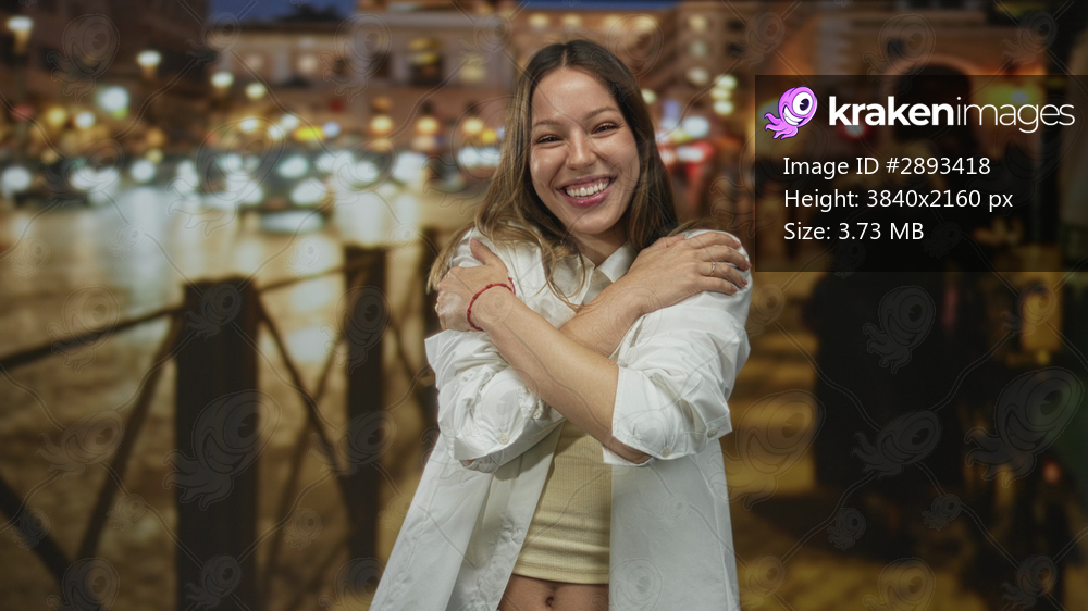 Woman smiling and hugging herself on a wet cobblestone city street lined with lights at night; self care wellness joy.