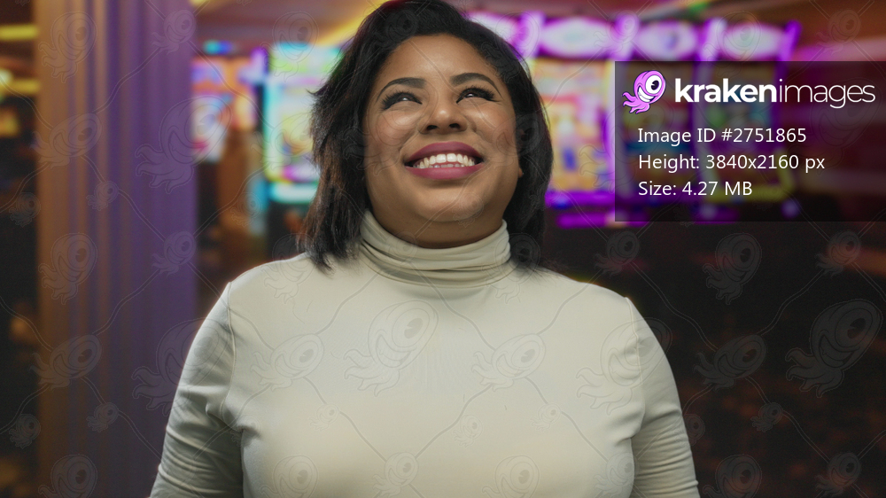 Woman smiling in a casino setting with vibrant slot machines in the background, showcasing a confident young hispanic plus-size presence indoors.
