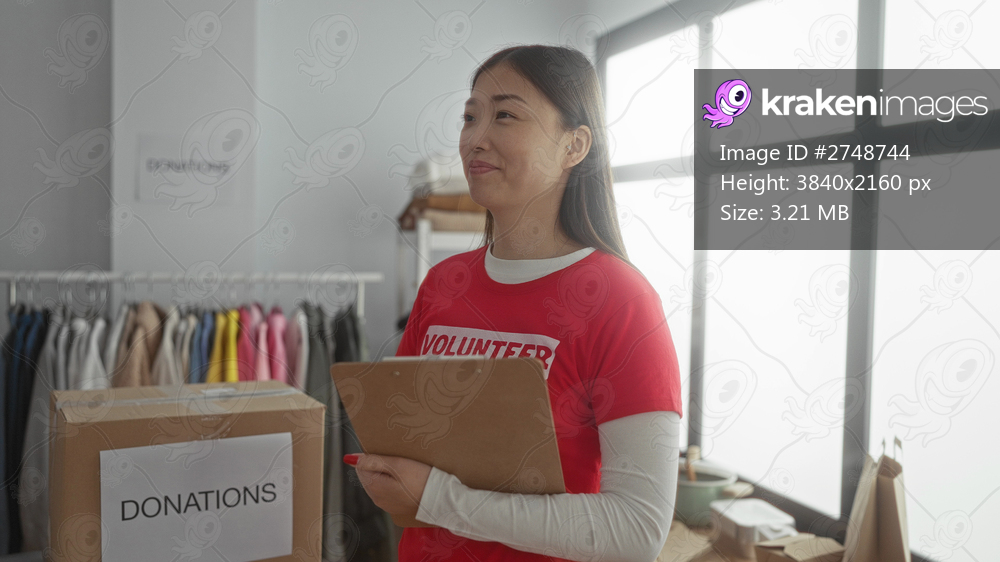 Woman smiling in a charity center wearing volunteer shirt holding clipboard in a room with donation boxes and clothes.