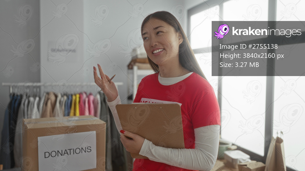 Woman smiling in a charity center wearing volunteer shirt holding clipboard in a room with donation boxes and clothes.