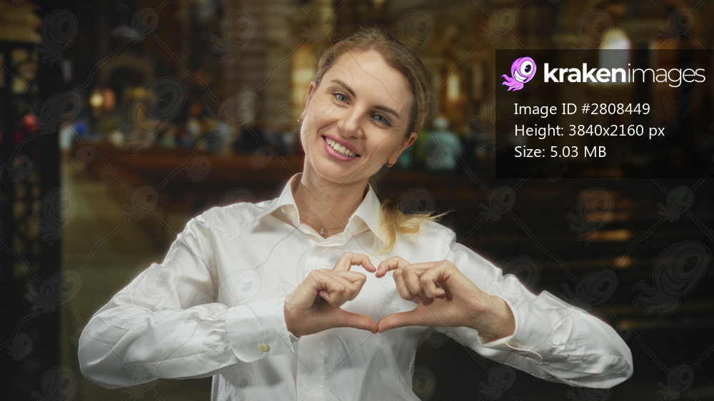 Woman smiling in a church interior, forming a heart with her hands, showcasing warmth and connection in a religious setting, surrounded by intricate architecture and dim lighting. - Kraken Images