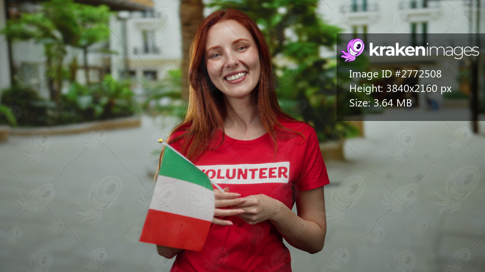 Woman smiling in a city street holds an italian flag wearing a red volunteer shirt and surrounded by greenery.